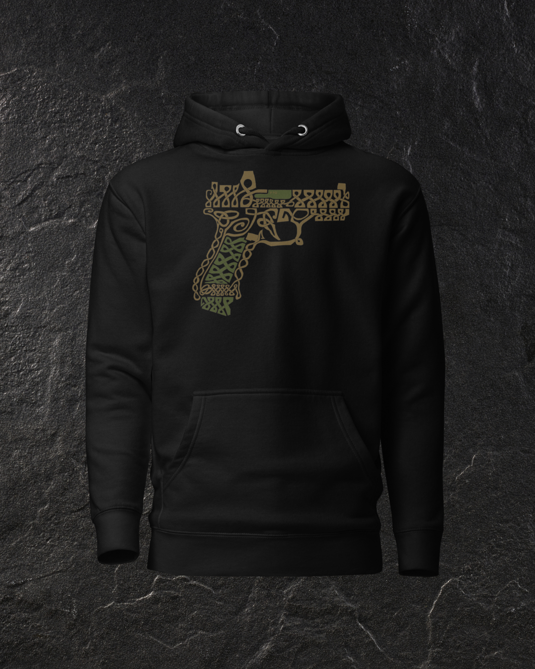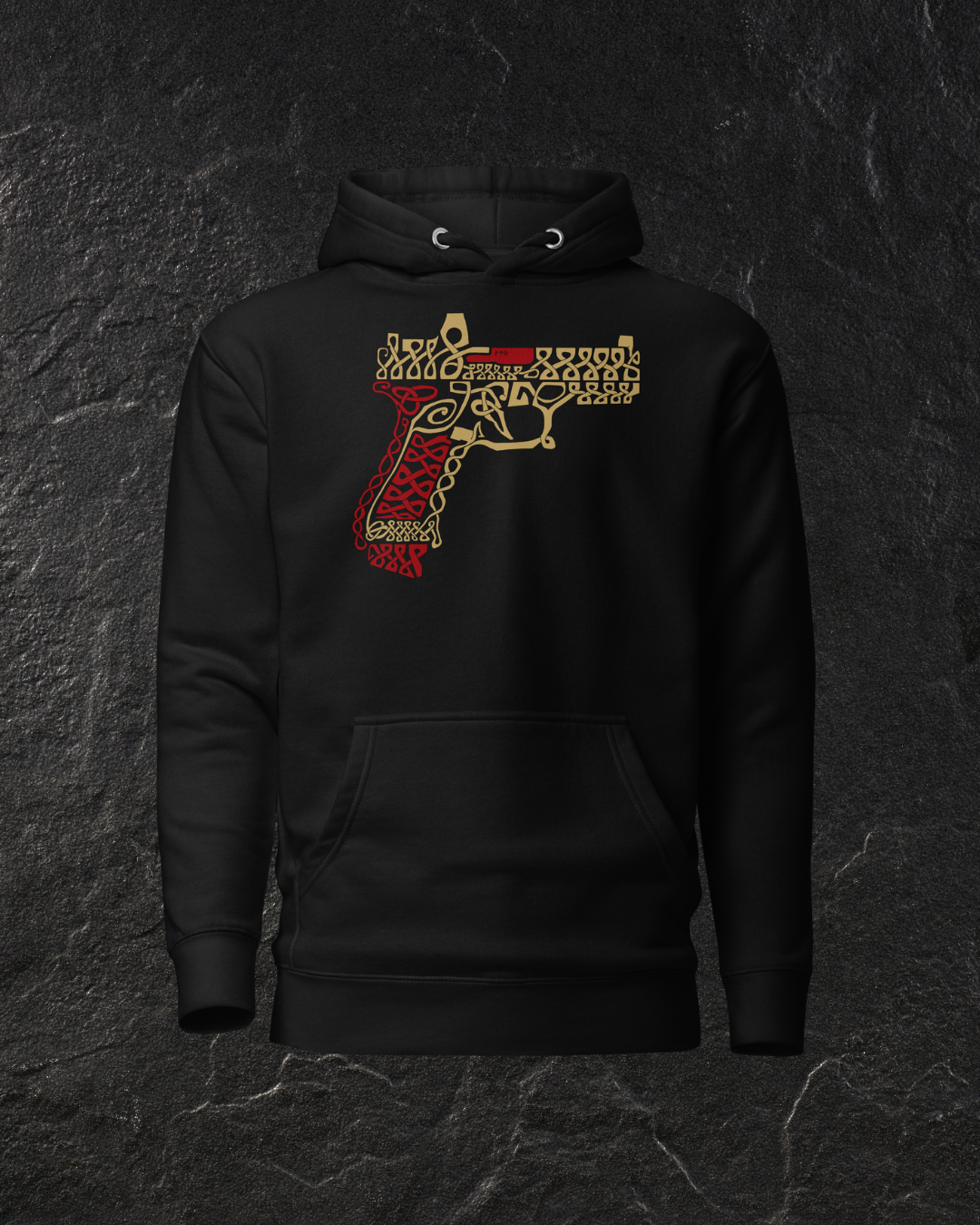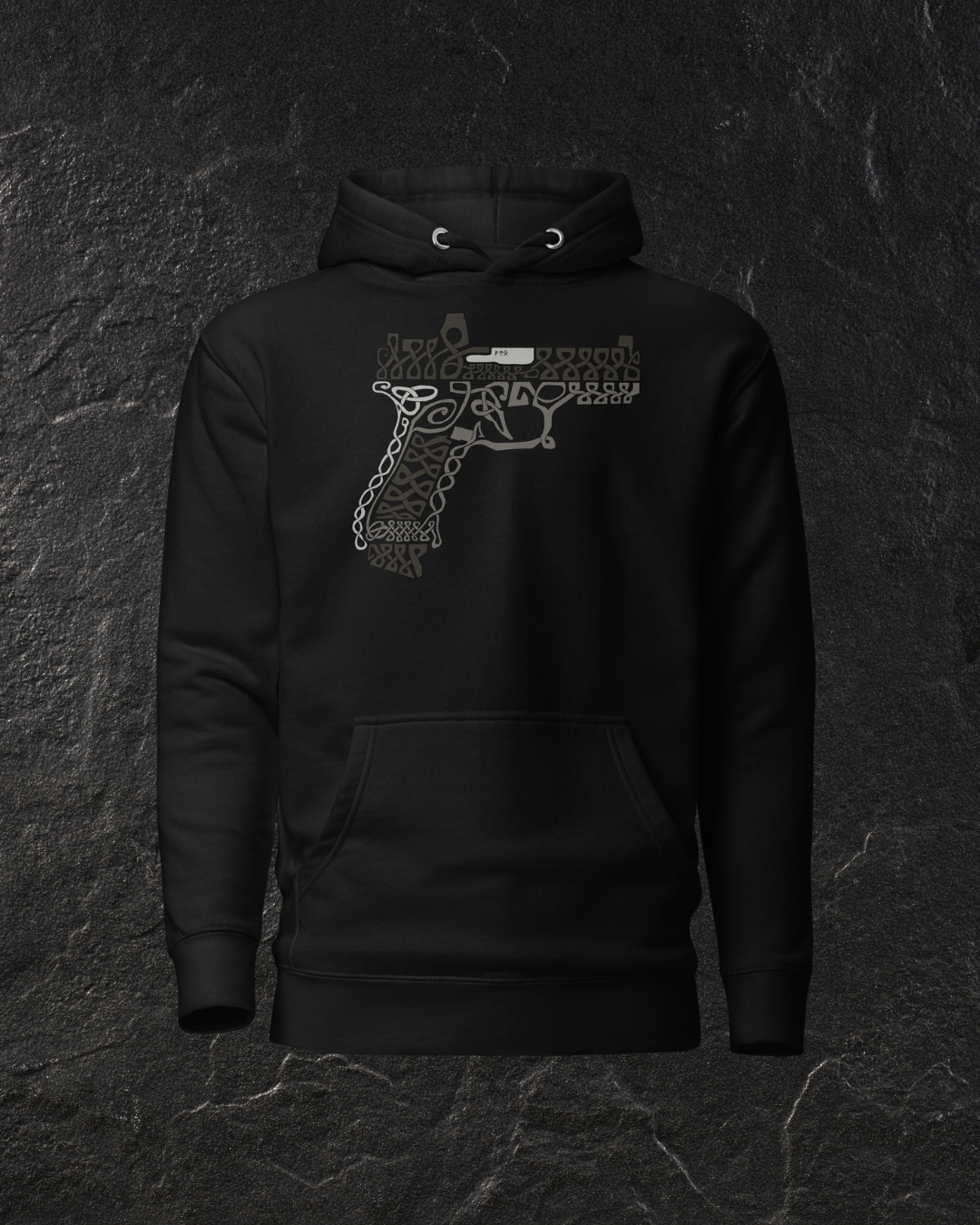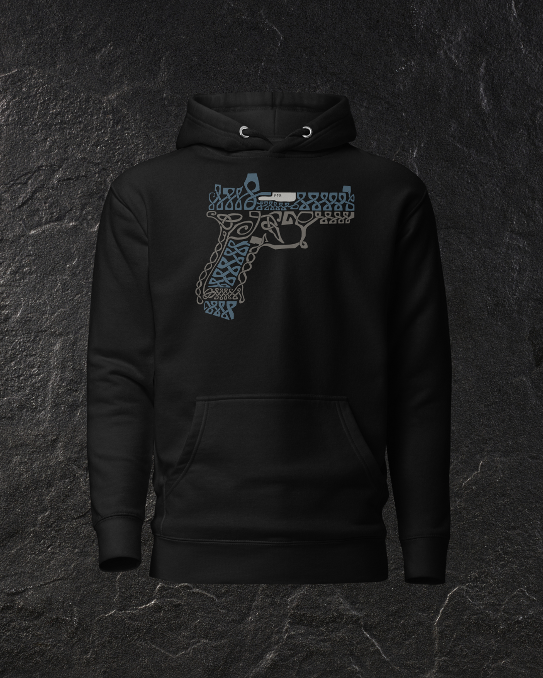 Inspired by the Nordic art work of old, and based on the iconic modern hand gun, the Glock. This is the first design completely drawn in house. and the first of a new collection of Nordic inspired weapon designs.
